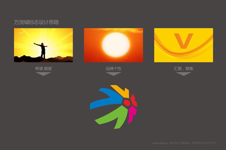 策略:以萬的首字母V字進行創意設計,V有匯聚、聚集的意思,陽光給人希望、展望的品牌理念